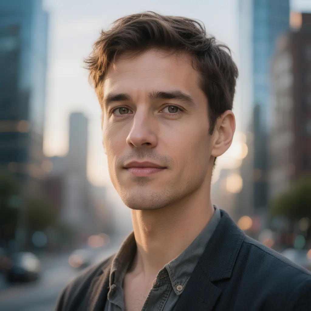 a dynamic city portrait comes to life: subtle head turn, natural blinking, soft smile; hair and clothing react to a gentle breeze; cinematic soft key light and rim light, shallow depth of field; smooth coherent motion, no camera shake