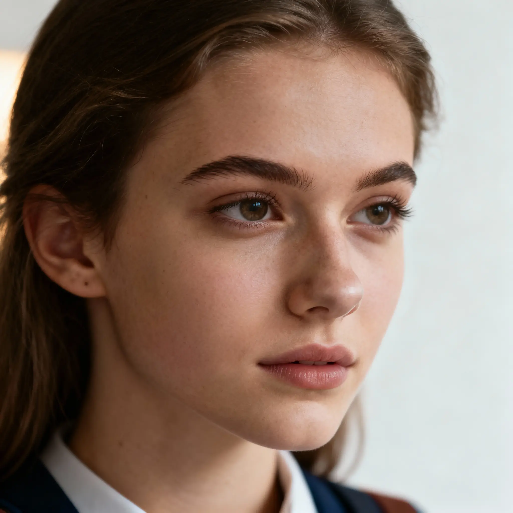 gentle head turn, natural blinking, subtle smile; hair reacts to breeze; cinematic portrait motion